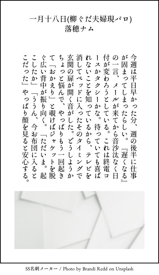 お帰りと出迎えるのも遅い日が多いと大変だよなー、というところからのこばなし。 https://ichinyo.site/media/Tcu2HUWHCnEObTaF-iA